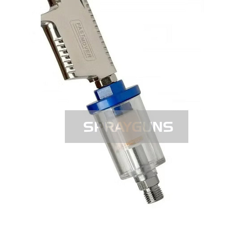 Mini air filter and water trap for use with most spray guns. Fit this mini water trap onto the spray gun to eliminate water from the compressor or airline entering the spray gun and contaminating the paint.